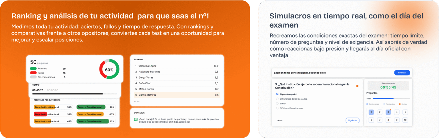 ¡Y muy completas! Analizamos tu rendimiento: aciertos, fallos, tiempo de respuesta, progreso por tema y ranking frente a otros opositores. Cada dato está pensado para ayudarte a mejorar y motivarte a seguir.