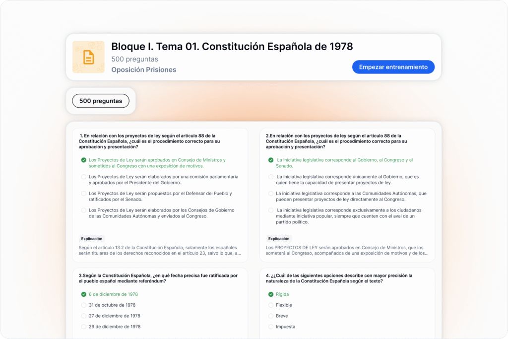 Practica sin límite hasta sentirte seguro. Miles de preguntas basadas en el BOE y normativa vigente. Cuantos más test hagas, más sólidas serán tus respuestas el día del examen.