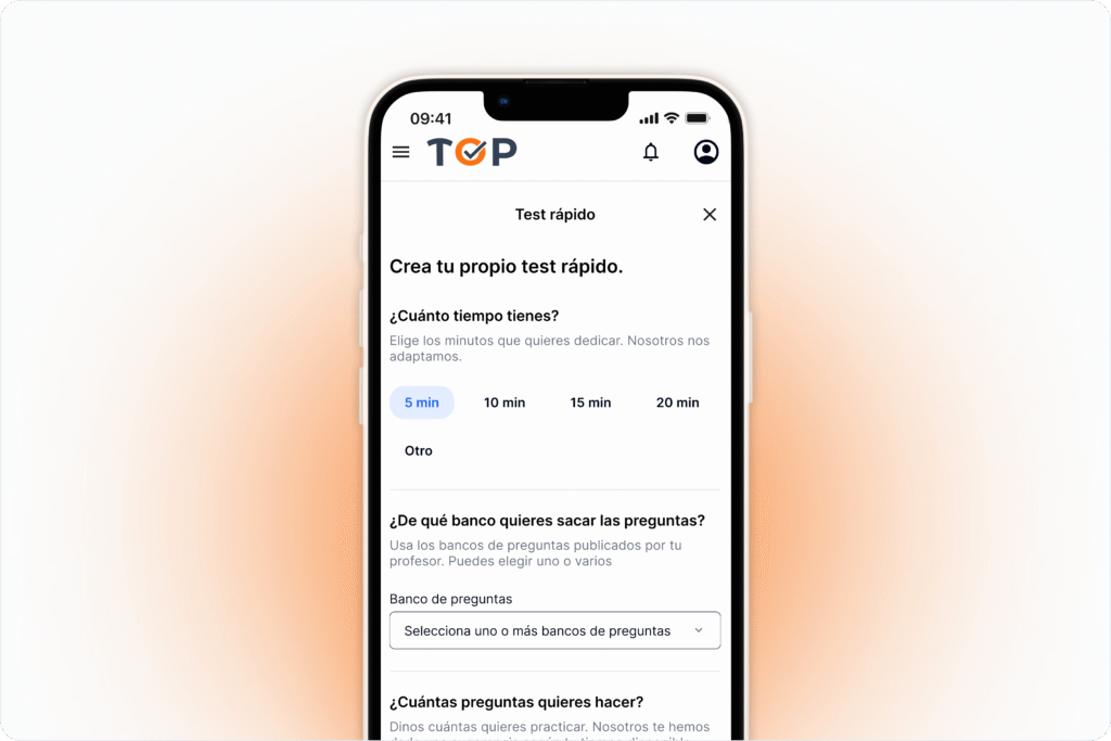 ¡Exacto! Tú decides: mezcla temas, selecciona cuántas preguntas quieres y ajusta el tiempo. Crea tu examen a tu medida y entrena como prefieras.